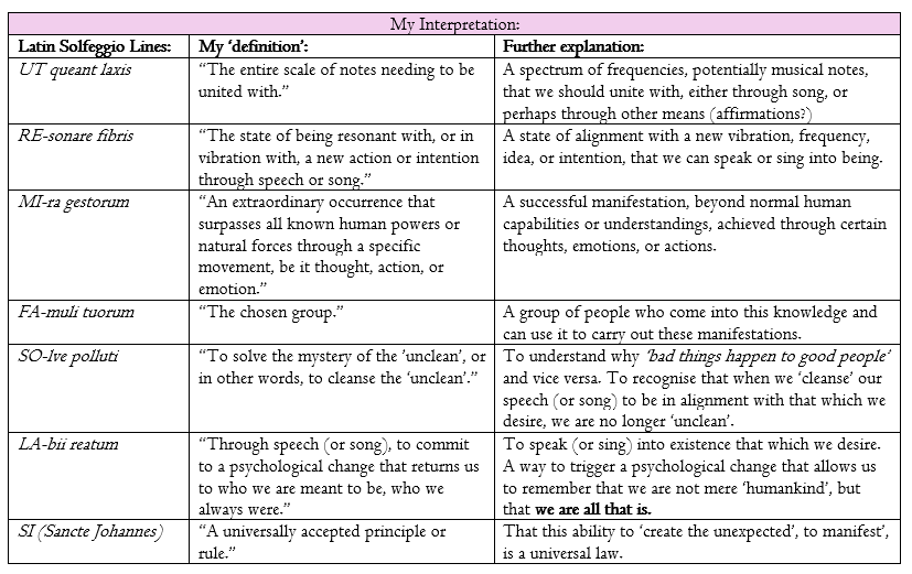 Now, I guess we can understand how these numbers (or codes) became related to sound. However, there are a couple of thinks that confuse me. In Figure 3, I have shared a table that Puleo and Horowitz share within their book, ‘The Healing Codes to the Biological Apocalypse’. Of course, I understand how the codes have been reduced using the Pythagorean Skein to form the pattern 9,3,6 (which funnily enough is one of the additional three Solfeggio Frequencies discovered later on, as discussed in Part 1). Yet, I am not entirely sure why they have been individually assigned to the Ut, Re, Mi, Fa So, La syllables. Is it simply because these syllables represent these six healing tones? Because musically speaking, these codes in Hz form do not relate to the scale sung within the ‘Ut queant laxis’ hymn. Another question I have is why these frequencies are considered to be healing? It seems much of this assumption comes from the meaning of the ‘Ut queant laxis’ hymn text, which we will explore a little further now…
